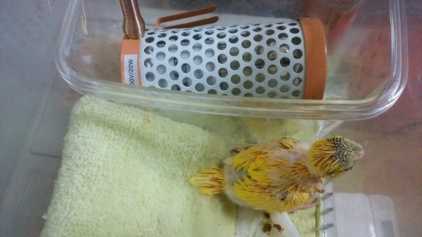 動きが大きくなる3週以降は、ミニプラケースにヒヨコ電球を入れて直接触れて火傷しないようにしてました。