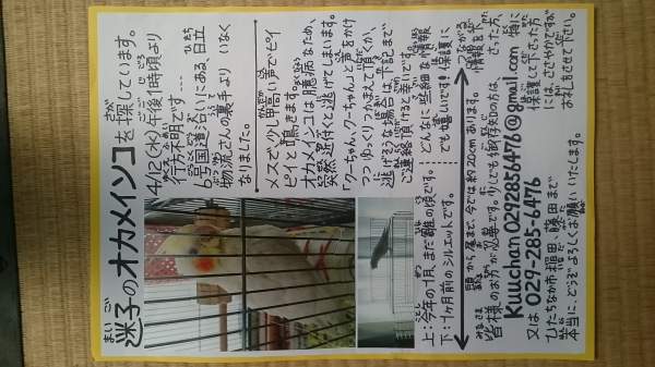 日時:2017年4月12日 場所:茨城県ひたちなか市 鳥の種類:オカメインコ 名前:クーちゃん 色:薄い黄色 特徴:クーちゃん、と話すことがあります。 届先:0292856476 投稿区分(本人or代理):本人 その他情報: