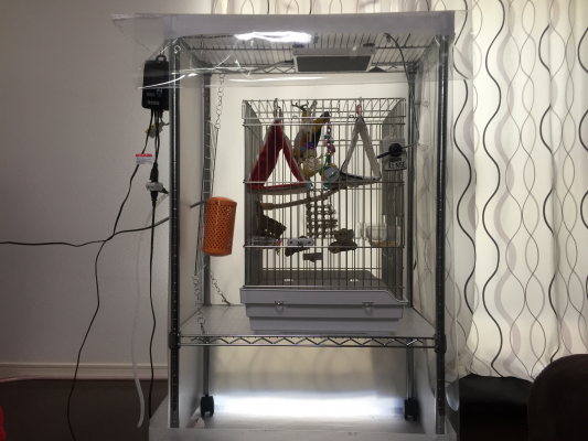 汚れ防止と保温、放鳥時の事故予防の為にプラダンとビニールクロスで囲っています。