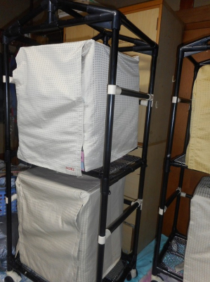 季節の用途に応じてスチールラックの周りをビニールシートやテーブルクロスを巻きつけて保温効果をあげたりしています