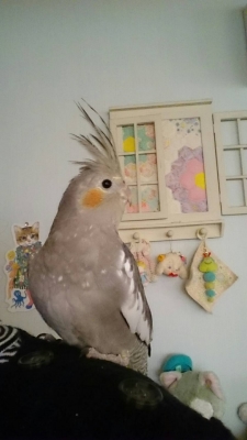 特徴:呼び鳴きが激しく、人見知りをします。手には乗りたがらず、頭や肩に登りたがります。以前爪切りの際に怪我をさせてしまい、羽の部分が若干血液で汚れています。好き嫌いはあまりせず、何でも食べます。粟穂が大好物です。
