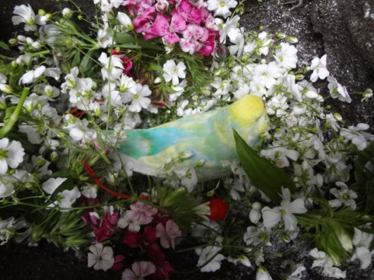 薔薇の花が奇麗に咲いている5月の夕方、セキセイインコが空の彼方へ飛び立ちました。1日、家の中を飛び回り、良く遊び、自分で鳥かごの(自分の部屋だと思っている)の中に帰り、その後10秒程の出来事でした。いつもと違う気ぜわしい鳴き方をしていたので、包丁を使う手を留めて見に行くと下に落下していました。呼びかけてみたけれど、可愛い顔のまま、動かなくなりました。あまりの突然の出来事に心がついていけません。何度、確認しても息をしてない事実は変わらず、、、。今、レモンの木の下に眠っています。