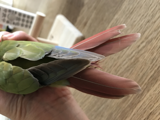 2週間程前から一人餌に切り替えケージデビューさせているのですが、最近ケージから出たがって暴れるようになり、尾羽根が何本も折れてしまっています。まだ根本が筆毛状態で出血を度々しているので、心配です。今のところ出血しても直ぐに血が止まってくれてるのですが、現在右側の尾羽根がおかしな方向をむいてしまっているので(根本の方で少し血が滲んで固まっている)大出血しないか気が気ではありません(︿。)