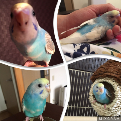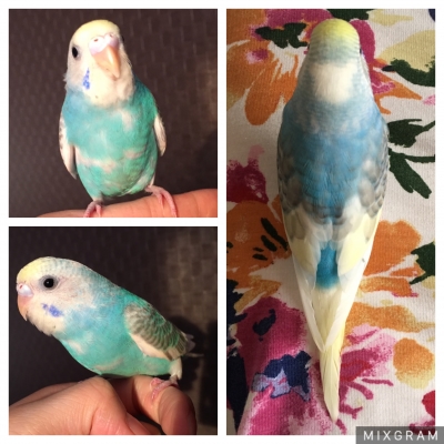 体はブルー、お腹と首の後ろに白が入っていて、首の後ろはミッキーの形ににた模様です。羽にグレーが混ざっています。