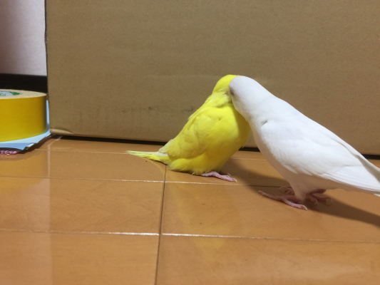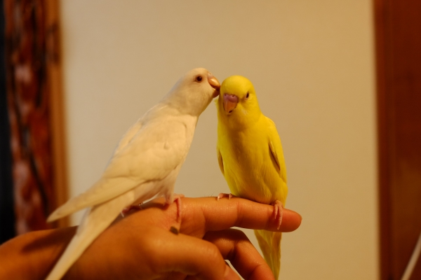 黄色と白一色のセキセイインコさん達きれいですね。
