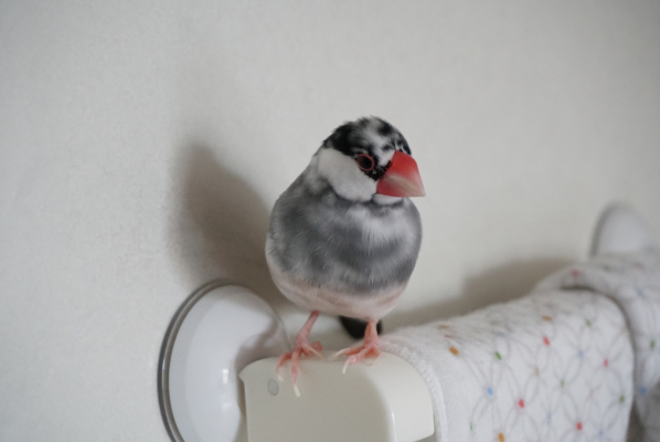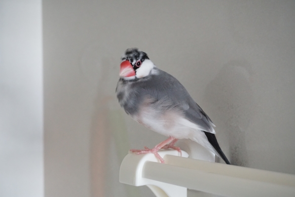 色:頭がいい黒と白のブチ、羽根がグレー、くちばしが赤