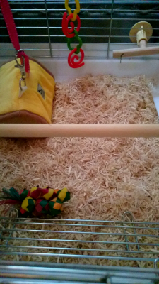 下には糞の状態葉が分かるようにキッチンペーパーを敷き、低い位置に止まり木が配置できれば配置します。