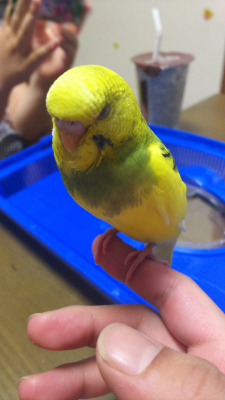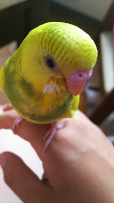 色:黄色、羽は緑、口の横は白と黒です