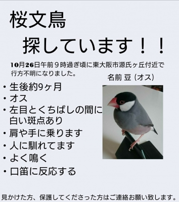 日時:2017年10月26日 場所:東大阪市源氏ヶ丘 鳥の種類:桜文鳥 不注意でベランダから逃がしてしまいました。 捜索しても見つからず、一ヶ月が過ぎてしまいました。心優しい方に保護していただいてると信じてます。心当たりありましたらご連絡お願いします。 警察署にも届け出をだしています。