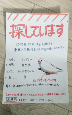 日時:2017年12月14日 場所:山口県下関市熊野小学校付近 鳥の種類:白文鳥 名前:シンドリー 色:白 特徴:足に障がいを持っています 届先: 投稿区分(本人or代理):代理 その他情報: