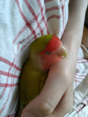 ケージの中に手を入れて、手の上で落ち着かせてやりました。