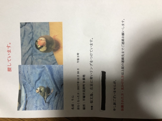 日時:2017年12月30日 午後3時 場所:神奈川県平塚市見附町 鳥の種類:桜文鳥 ♀2歳 名前:りん 色:グレー 頭シッポ黒 ほっぺ白 特徴:水色の足輪 届先:平塚警察署 0463 31 0110 投稿区分(本人or代理):本人 その他情報:手乗りです
