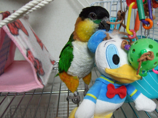 この子、ヒトも好きなんですが、同種のインコと遊びたい気持ちがとても強いようなんです。先住のメキシコシロガシラインコはうるさいこの子が大嫌い。