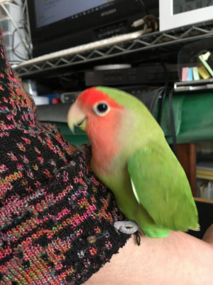とても大切にしているコザクラインコ探してます。放鳥中、来客があり、玄関ドアを開けた隙に旅立ちました。頭、腕、肩に乗るとても人に慣れたおとなしい子です。3才位の雄です。余り鳴きません。噛み付く事もなく、甘噛みします。神奈川県藤沢市の自宅から出発。行方不明中。