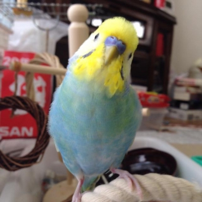 特徴:2歳、オス。最初は警戒心強め、臆病。慣れると直ぐに手に乗る。手乗り。お話しする。少し小柄。