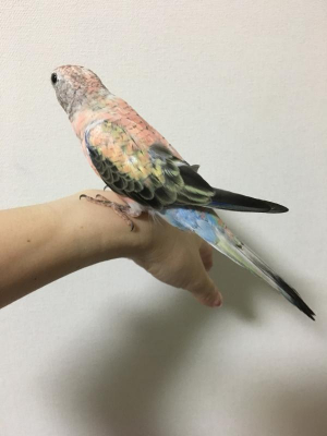 色:頭と胴体/薄ピンク・顔/グレー・羽先/黒・背中とお尻/水色と黄緑