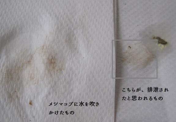 追記:今回の排泄された水分をキッチンペーパーで吸い取ったものがあったので