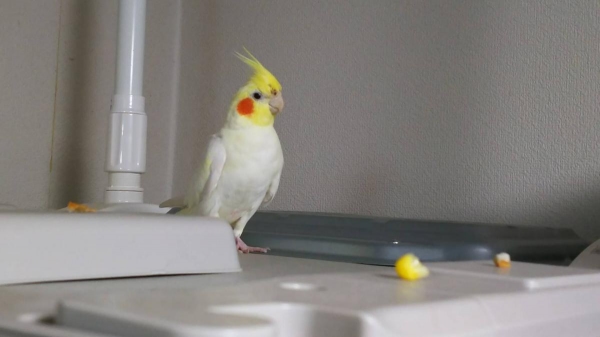 特徴:ミッキーマウスマーチや鶯の鳴きまねでホーホケキョと鳴きます。機嫌のいい時は小声でずっと歌っています。また肩に乗っている時はケケケケ、ギョギョギョ等と甘えるように鳴きます。手乗りで人懐こく、カキカキを要求する時は手のひらに頭を押し付けるような行動をとります。ペットショップで購入時、羽を切られていて、まだ生え変わっていない箇所があり一部その名残があります。鼻の穴が少し大きめで右側の鼻の穴の周りの毛が少し黒ずんでいます。
