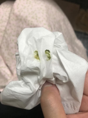 2枚目の写真も同じ時間帯にした糞のようですが、水気は少なくネバネバしていて明るい緑色でした。