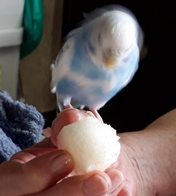 つぶちゃんの豆苗の狭い器の水浴びは相変わらず最高に可愛いですね✨すももが好きなんだ。まめちゃんは梨が最近のお気に入りみたいですね。まめちゃん羽根がフサフサで綺麗ですよ?