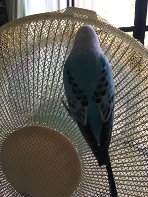 扇風機で涼むピーコくん、上に乗ってるかと思いきや、この位置なんですね?