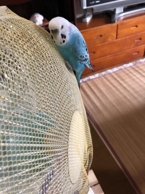 扇風機で涼むピーコくん、上に乗ってるかと思いきや、この位置なんですね?