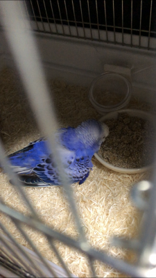 愛鳥自身は、脚が動かないためぺたんとしていて、カゴの隅っこでずっと寝ています。膨らんだりはしていません。飲食のときだけ起きて、そのときは結構ぱっちりと目もあいていて、声をかけるとおしゃべりしてくれたりもします。