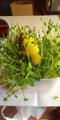 本人(鳥)は、けろっと元気にプラケーの中でさえずったり、ご飯たべたり、豆苗食べたりしています。