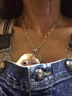 家中、放鳥しているときはいつも私の身体のどこかにいて