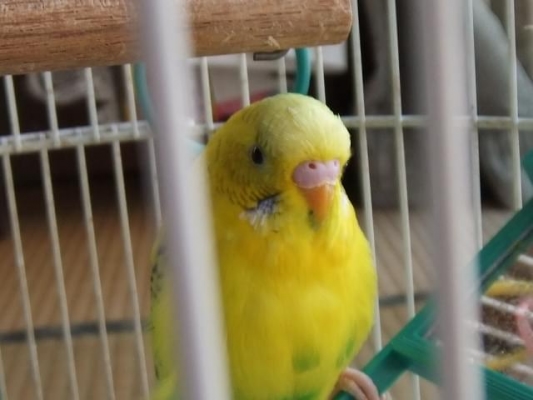 特徴:黄色い体に、お腹あたりがまだらな黄緑、風切り羽に黒い斑点があります。男の子なので、ろう膜が青いです。