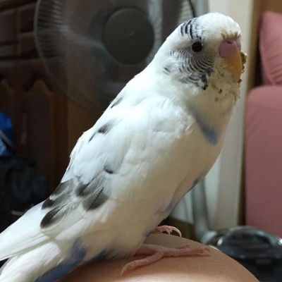 色:全体的に白、お腹に少し青、頭に薄く黒のシマシマ模様あり