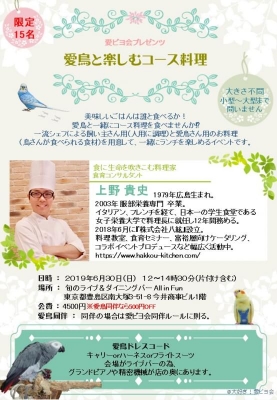 皇室にもお料理を提供した事があるシェフを迎えて、同じ食材を使って「飼い主さん用」と「鳥さん用」でお料理をそれぞれに分け、楽しい時間を一緒に楽しめる同伴会です。
