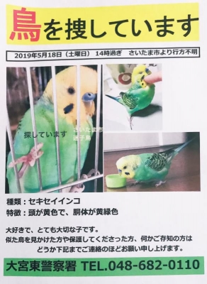 日時:2019年5月18日 14:00〜 場所:埼玉県さいたま市 鳥の種類:セキセイインコ 色:頭が黄色で、胴体が黄緑色 届先:大宮東警察署 投稿区分(本人or代理):本人