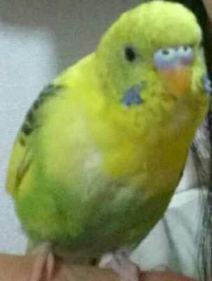 特徴:4月生まれの全体は黄色のセキセイインコです。おしゃべりはしませんが、人懐こいです。左頬に丸い黒い模様が一つあります。探しております。