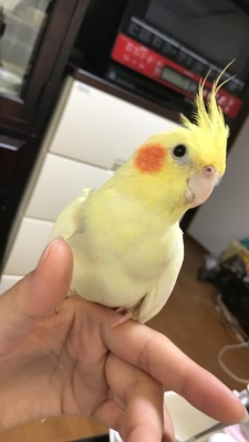 特徴:1歳。おしゃべりはできません。濃いオレンジ色チークパッド、足の爪の先が一部黒い。背中の羽が一部シナモングレーの羽。人懐こく手を出すとすぐ人の手に乗る。指を出すと頭をかいてもらうためにすぐ出します。