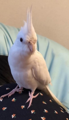 全身真っ白なオカメインコ で、手乗りでとても人なつこいです。