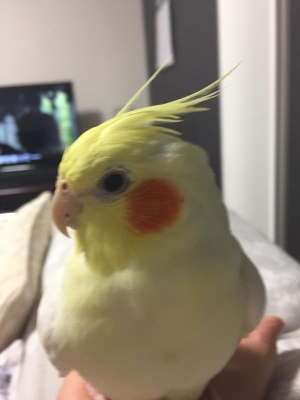 特徴:頭とシッポは薄い黄色。チークはオレンジ色。羽は白っぽいです。