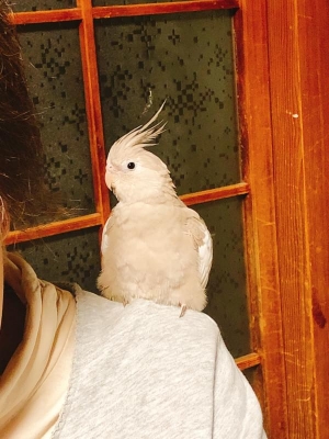 とてもおっとりした子で臆病です。大きい物音や突然手を出したりするとびっくりして飛んで行ってしまいます。