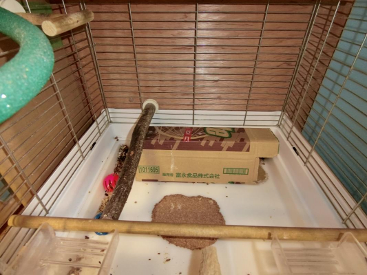 ケージにおもちゃなどを入れる時は、目に見えるところにおいておき、怖がらなくなってから入れるとか言われてるけど、うちの子は関係ないみたいでした。バードテントで寝てもらおうと、おやつを入れても、そーっとおやつだけとっておしまい。結局保温はアクリルケースで、ケージ全体を暖めました。今は、断熱材と板で3つのケージを一緒に保温してます。