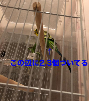最近は餌入れがお気に入りで、よく餌入れに着地しています。おそらく餌入れに着地していたときに何度かフンをしたので、それが餌とあいまってついているんだと思います。