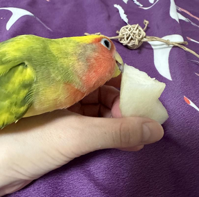 瑠瑠が、幸水梨を食べることが1羽でできました。