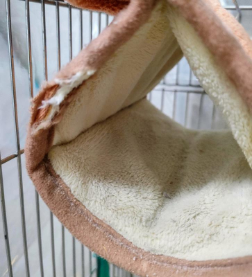 ケージをよじ登りながら、ソファーなどにぴょんと移り、私のところへ来て、暖をとることができています。