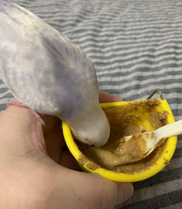 蓮(れん)は、一人餌にチャレンジ中で、挿し餌のスプーンごとケージに設置していますが、未だに私の帰宅を待っています。