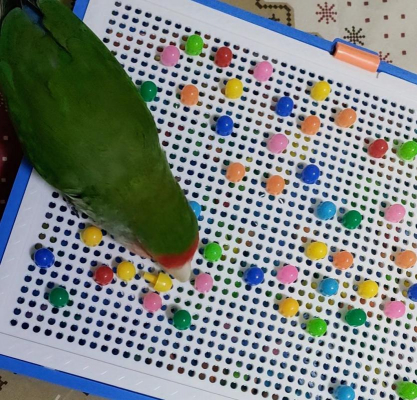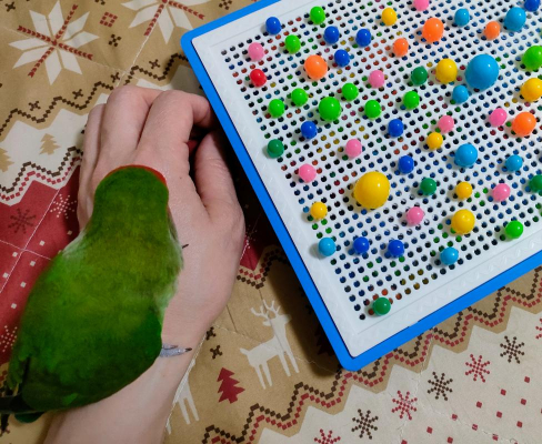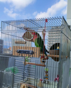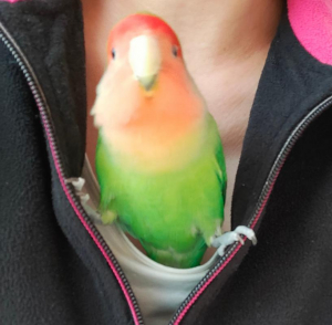 今現在も、2羽が左肩にとまり、羽繕いをしています。