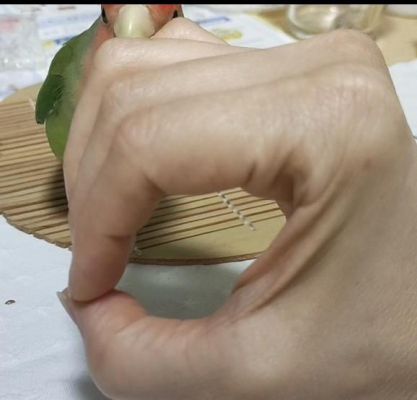 瑠瑠(るる)は、ケージを開けましても、ケージの隅で巣作りの作業をしていますし、大抵は紙切りをし、偶に零(れい)が居る私のそばに来てくれます。