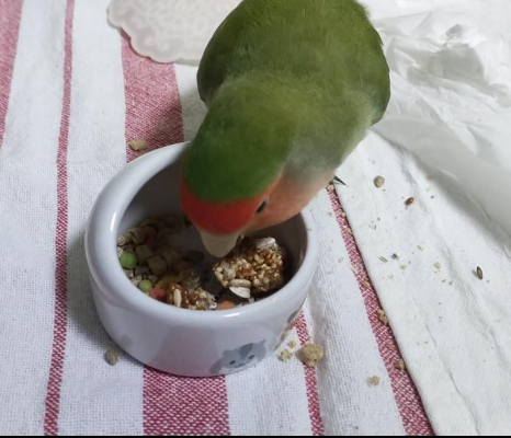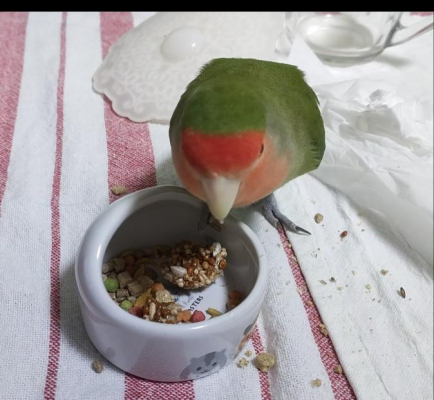 放鳥時、その器をテーブルに置いておいたら、必死になってかじっていました。