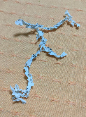 今日も帰宅したらくぅがレシートで傑作作品を作り上げていました。