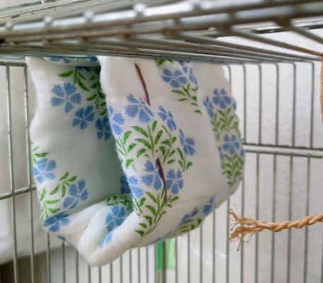 放鳥時間中に、私のベッドの所へ来て、潜っています。