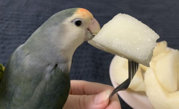 幸水梨を零(れい)に見せてみますと、片手に乗りながら、クチバシを滑らせ、果汁を吸っていました。