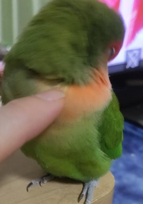気が済んだ後の零(れい)の姿は、顔やクチバシ周辺には桃の果汁がたっぷり付着し、そのままケージに入り、クチバシを擦り付けていました。